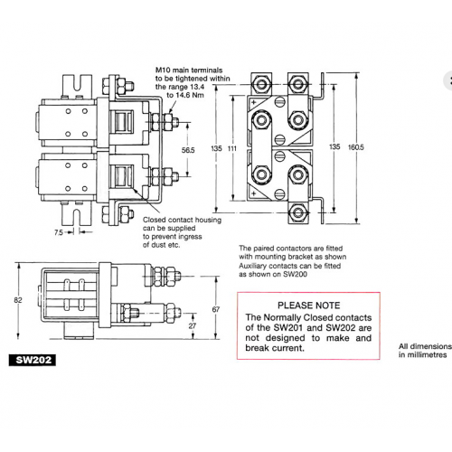 Motorun tersine çevrilmesi için tasarlanmış ana kontak devresi yerleşik bir arızaya sahiptir, böylece her iki bobine aynı anda enerji verilirse kontak düzenlemesi açık devredir. SW202'de tek kutuplu çift atış, gümüş alaşımlı uçlarla çift kırma ana kontaklar bulunur, bunlar kaynak dirençli, aşınmaz ve iletkenliği yüksektir. SW202, M10 saplama ana terminallerine ve 6.3mm spade bobin bağlantılarına sahiptir. M5 kılavuzlu delikler veya montaj braketleri aracılığıyla monte edilebilir - takılı olarak tedarik edilir veya ayrı öğeler olarak verilir. Montaj, dikey olduğunda M10 kontak saplamaları yukarı bakacak şekilde dikey veya dikey olabilir. Gereklilik aşağıya doğru yönlendiriliyorsa, kontaktörün bunu telafi etmesi için ayarlayabiliriz.