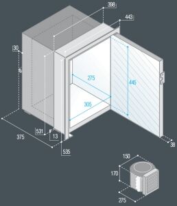 Vitrifrigo buzdolabı. C42LX OCX2. Paslanmaz çelik kapaklı. Kompresör ünitesi dolabın 1,5 metre uzağına kadar konabilir.