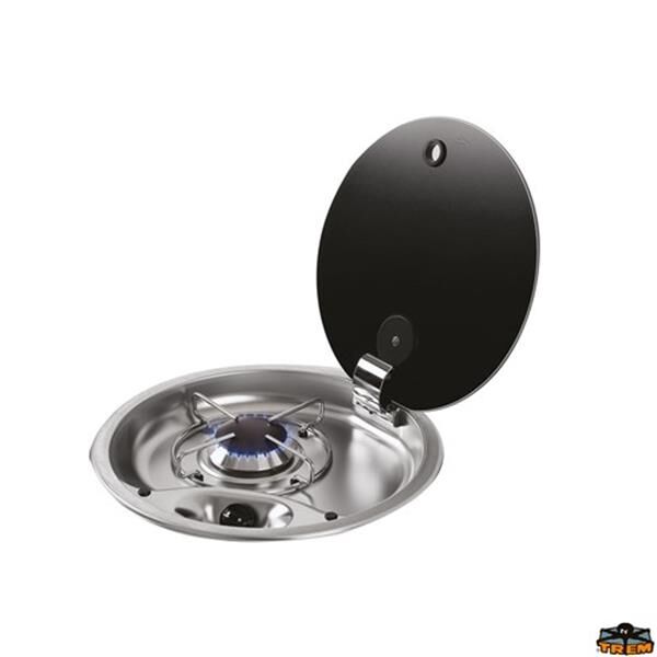 Paslanmaz çelikten yuvarlak gömme ocak, kendinden kilitli kapaklı 1 brülör gaz kaynağı, titreşim önleyici lastik pedlerle sabitlenmiş paslanmaz çelik destek ızgarası mevcuttur. Gizli menteşeli temperli siyah cam kapak.