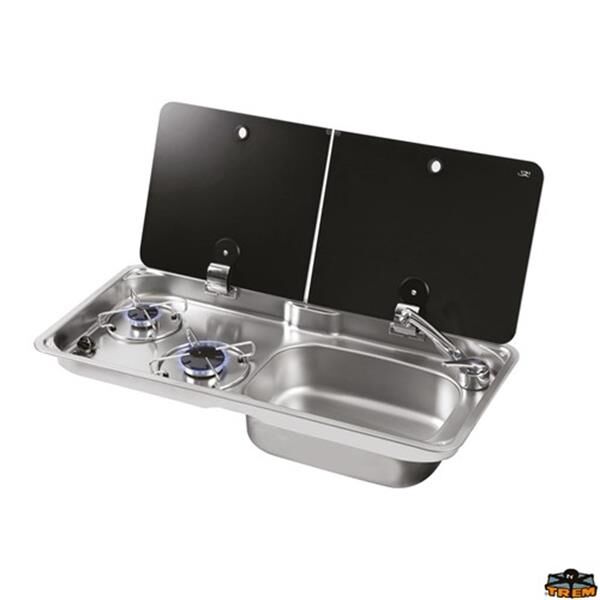 Paslanmaz çelikten yapılmış, 2 brülörlü gaz beslemesi, sağda dikdörtgen lavabo ile donatılmış, titreşim önleyici rondelalarla sabitlenmiş paslanmaz çelik destek ızgarası. Gizli menteşeli, temperli siyah camdan çift kapak, pişirme alanı ve lavabo arasında bölünmüştür.
