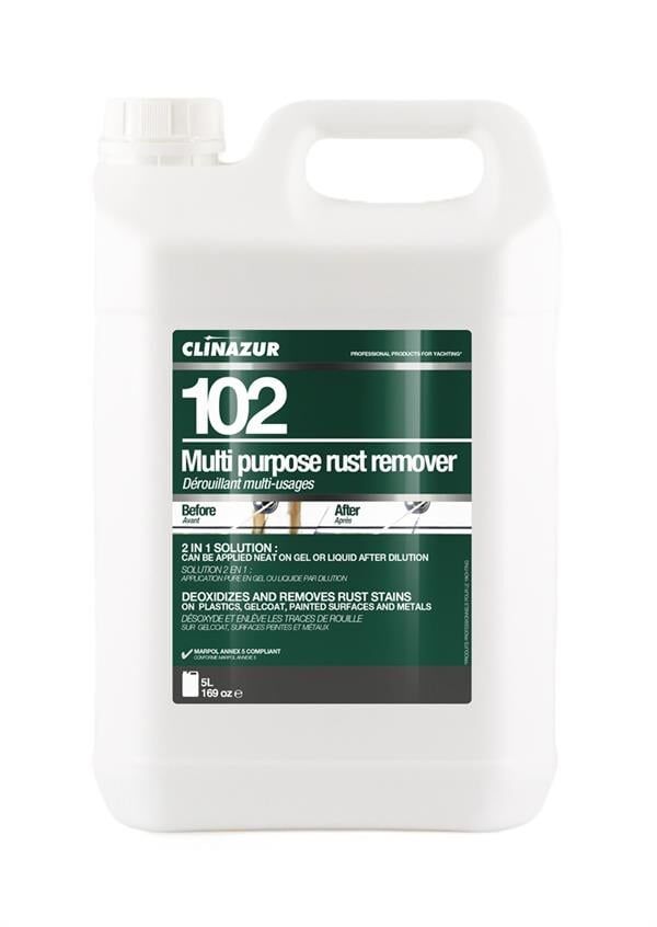 Clin Azur 102, geniş yüzeyleri (sararmış veya oksitlenmiş teknelerin gövdeleri) ve damlamaları ile yerelleşmiş pas lekelerini işlemek için kullanılan konsantre bir asit formülasyonudur. Jel formülasyonu, kullanıcı için daha güvenlidir ve dikey yüzeylerde daha etkili bir uygulamaya ve damlama ve sıçramalar olmadan daha güvenli bir kullanıma olanak tanır.