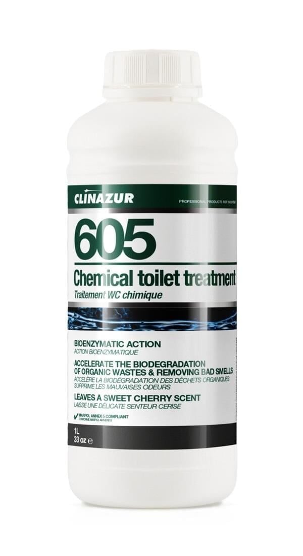 605, kimyasal tuvaletlerin arıtılması için patojen olmayan bakteri, yüzey ajanları ve biyolojik uyarıcılar içeren sıvı bir formülasyondur. 605, organik atıkların biyolojik olarak parçalanmasını büyük ölçüde hızlandırır ve kötü kokuları giderir. Aynı zamanda toksik değildir ve kostik değildir (yakıcı değildir). Düzenli kullanımı, tehlikeli kimyasalların kullanımını yüksek oranda azaltacaktır.