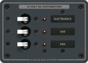 Blue Sea Systems DC 3 pozisyonlu sigorta paneli. 12V DC. 95x133mm. 30 adet DC Etiket.3 adet 15A otomatik sigorta.