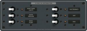 Blue Sea Systems DC 6 pozisyonlu sigorta paneli. 12V DC. 95x267mm. 30 adet DC Etiket. 6 adet 15A otomatik sigorta.