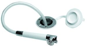 Duş ve yuva. 2.5 metre hortumlu, beyaz plastik gövde, krom başlık.