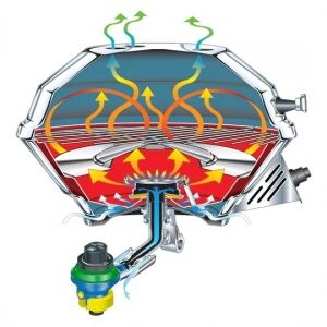 18-9 paslanmaz çelik radyan ısıtıcısı ile fırın, ocak veya mangal olarak kullanıma imkan sağlar. Ocak olarak kullanıldığında direkt alev verebilirken, mangal pozisyonunda mükemmel ısı dağılımı sağlar. Menteşeli kapağı rüzgar etkisini ortadan kaldırmaya yardımcıdır. Piezo çakmaklıdır. Mini propan tüp ile çalışmakla beraber, eğer teknede mevcutsa bütan/propan tpü de adapte edilebilir. Tamamen paslanmaz çeliktir. Montaj kiti ve tüp ayrıca sipariş edilmelidir.Model A10-207
