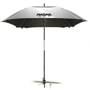 Magma tekne şemsiyesi. %100 UV korumalıdır. Paslanmaz çelik ve anodize alüminyumdan yapılmış braketi ile Ø 22/25 mm vardavelaya kolayca monte edilir, her türlü pozisyona ayarlanabilir. Kumaşı solmaz ve akrilik kaplıdır. 150x150 cm.Renk Gümüş