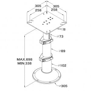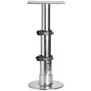 Masa ayağı, gazlı amortisörlü. Ağır hizmet tipi. Alüminyum. 100/88/72 mm çaplı, iç içe üç borudan oluşan ayak yüksekliği 33 ile 71 cm arasında ayarlanabilir. Taban Ø 305mm, masa tablası montaj plakası 32x32 cm’dir. Model Parlak anodize alüminyum