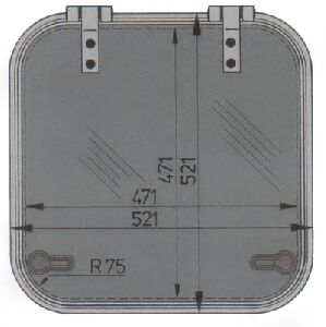 Vetus hatch. Tip Planus. Anodize alüminyum çerçevesi 75 mm köşe açılıdır. Camı 10 mm duman rengi akriliktir. İç finisyon çerçevesi ve sineklik opsiyonel ekipman olarak sunulmaktadır.Tip PLA50
