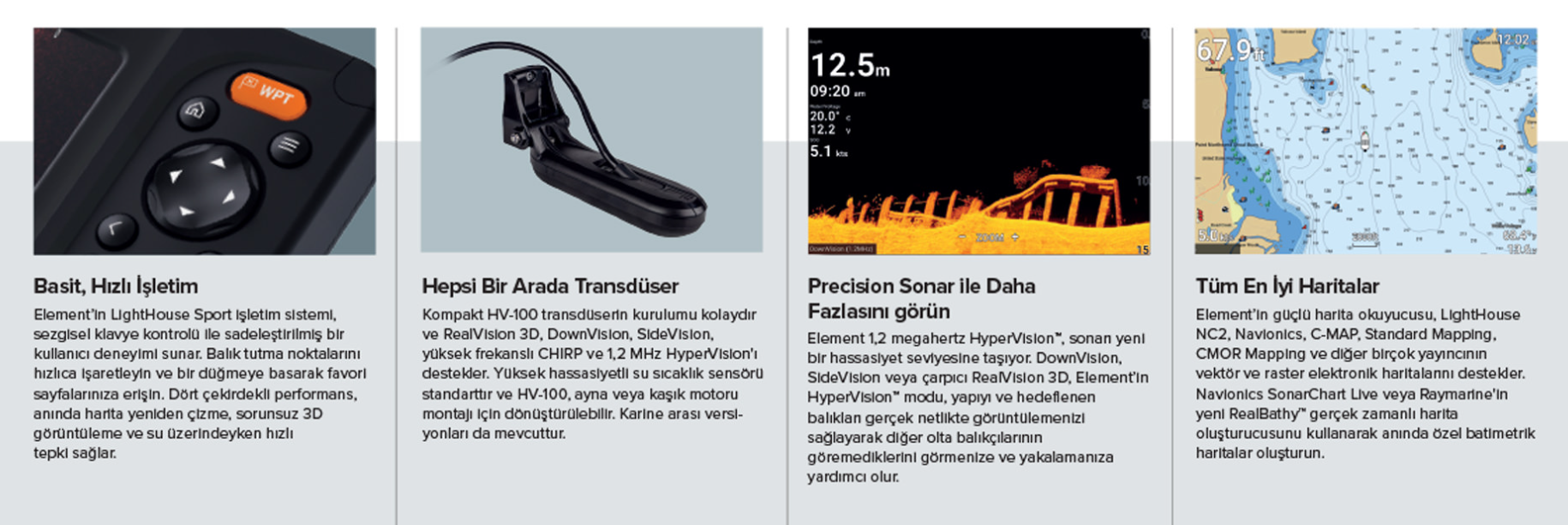 Avda bir adım önde olmak isteyen olta balıkçıları için üretilmiş Element, HyperVision™ 1,2 megahertz süper yüksek çözünürlüklü sonar ile su altı dünyasının en net görüntüsünü sunar. HyperVision; DownVision, SideVision ve Raymarine RealVision 3D sonarı bir sonraki hassas görüntüleme ve balık tanıma seviyesine taşır ve yapıları, bitkileri ve balıkları gerçek netlikte görmenizi sağlar.