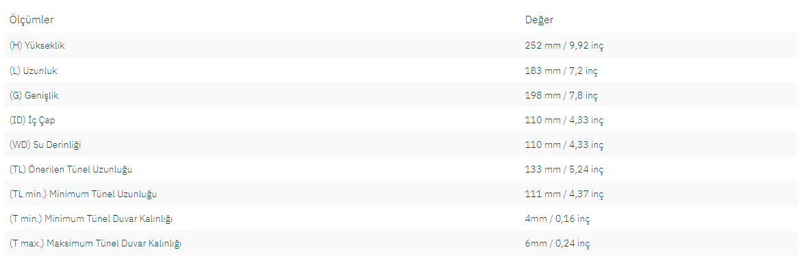 (TL min.) Minimum Tünel Uzunluğu111 mm / 4,37 inç