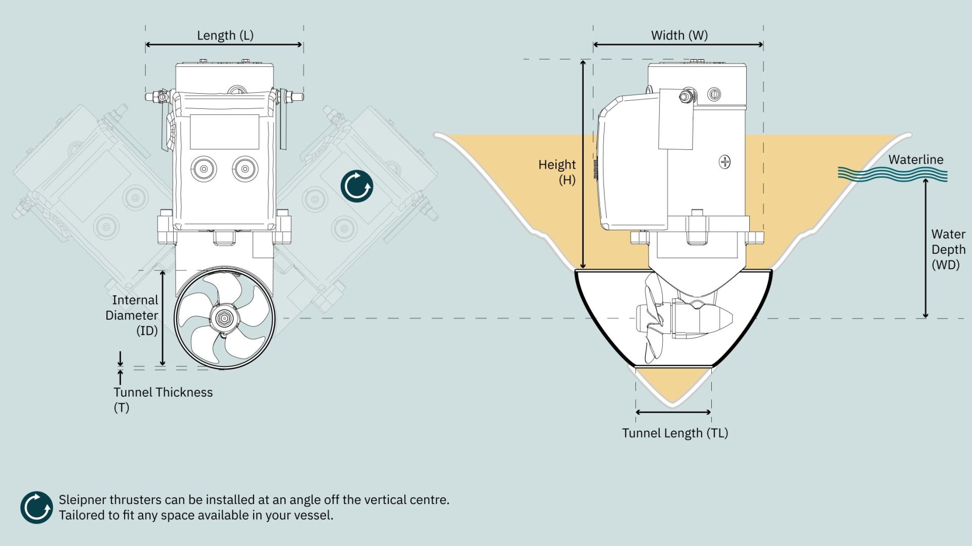 Sleipner, sahip olduğunuz alanla çalışmak için kurulum esnekliği sunar. İtici modellerimiz, geminizdeki herhangi bir alana uyacak şekilde tasarlanmış, tünelde herhangi bir açıda kuruluma izin verir.