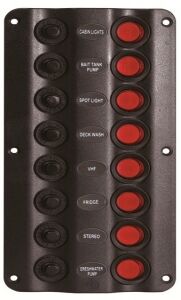 Sigorta paneli. 12V DC. Dalga dizaynlı. Siyah plastik. Otomatik sigortalı ve led indikatörlü switch’li.Switch 8