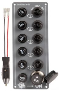 Sigorta paneli, 5´li, çakmak prizli. Çakmak tipi fiş ile sunulmaktadır. Panel 170x70 mm alüminyum.