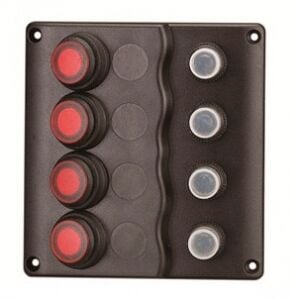 Su geçirmez sigorta paneli. 12V DC. Dalga dizaynlı. UV ışınlarına mukavim siyah plastik. 15A otomatik sigortalı ve led indikatörlü UL onaylı su geçirmez switch’li.Switch 4