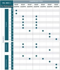 Önerilen örnek evaporatör, hacim, kompresör ve devir oranları aşağıda gösterilmiştir.