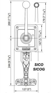 Vetus kumanda kolu. Tekli, yana montaj. Plastik gövde paslanmaz çelik kol. 147x127x75x274 mm. (boyxenxyükseklikxkolun merkezden yüksekliği). Mekanizma derinliği merkezden 244 mm.