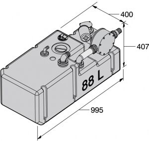 Sistem 12V bir adet pis su pompası, bakım kapağı, ultrasonik seviye şamandırası, Ø 38mm açılı çıkış, Ø 16mm açılı havalandırma çıkışından oluşur. Açılı pis su dolum dirsekleri ayrıca sipariş edilmelidir.Hacim 88 lt