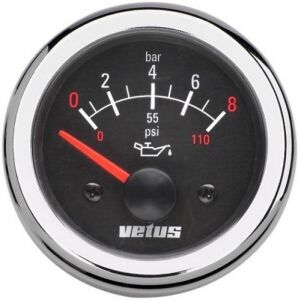 Vetus yağ basınç göstergesi. 0-8 Bar (0-110 PSI) Ø 52mm. Siyah ve kromaj iki adet çerçeve standarttır. İhtiyaca göre çerçevelerden herhangi biri kullanılabilir.Tip Siyah kadranlı