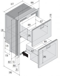 Vitrifrigo Buzdolabı/dondurucu. DW180 OCX2 DTX. Çekmeceli tip. Paslanmaz çelik kapak ve çerçeveli. Alt gözü buzdolabı, üst gözü ise derin dondurucudur.