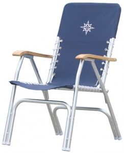 Yat sandalyesi. Anodize alüminyum gövde, mavi kumaş döşeme. 65cmx55cmx92mm h.